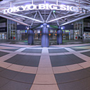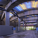 Conference center main entrance at night, big patterns on floor and ceiling, remastered
