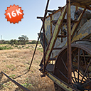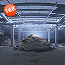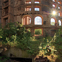 abandoned and burned out factory, daylight, plants, high walls, remastered